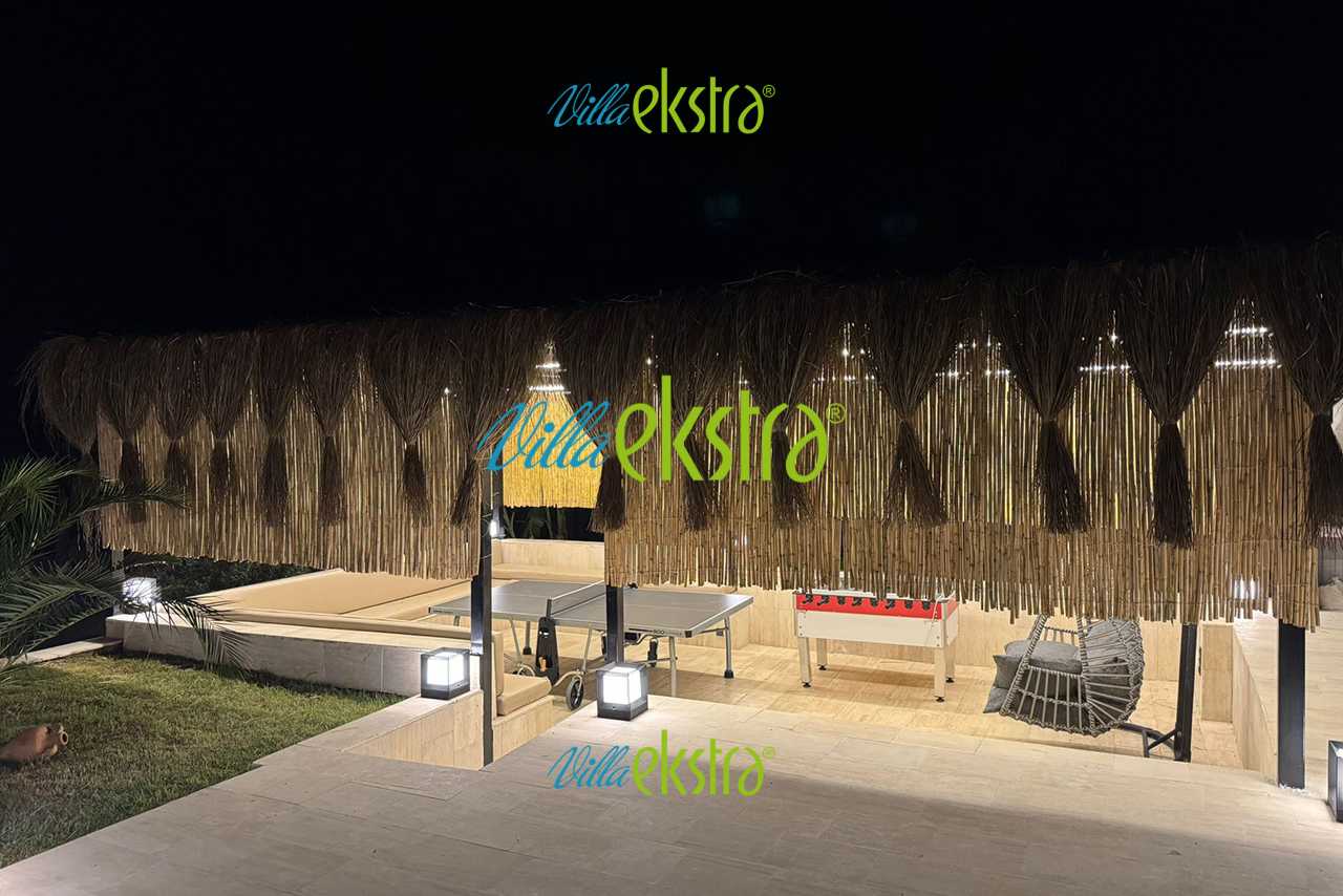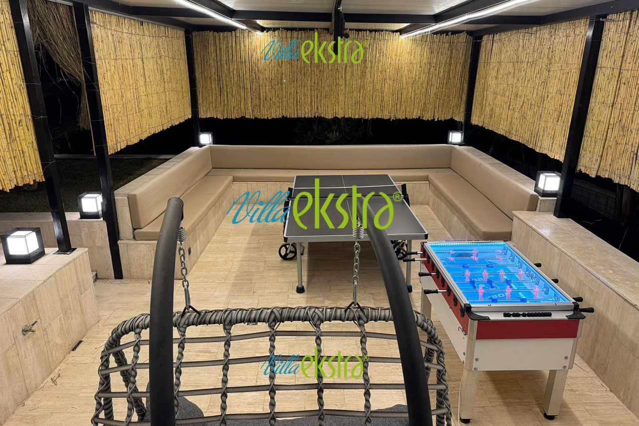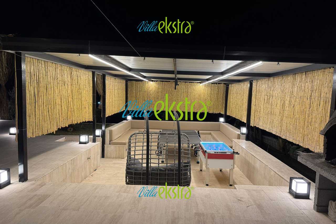 Ferah ve geniş bir oturma alanı, barbekü, 4 adet şezlong, langırt, masa tenisi, damla salıncak yemek masası ve sandalyeler bulunmaktadır.