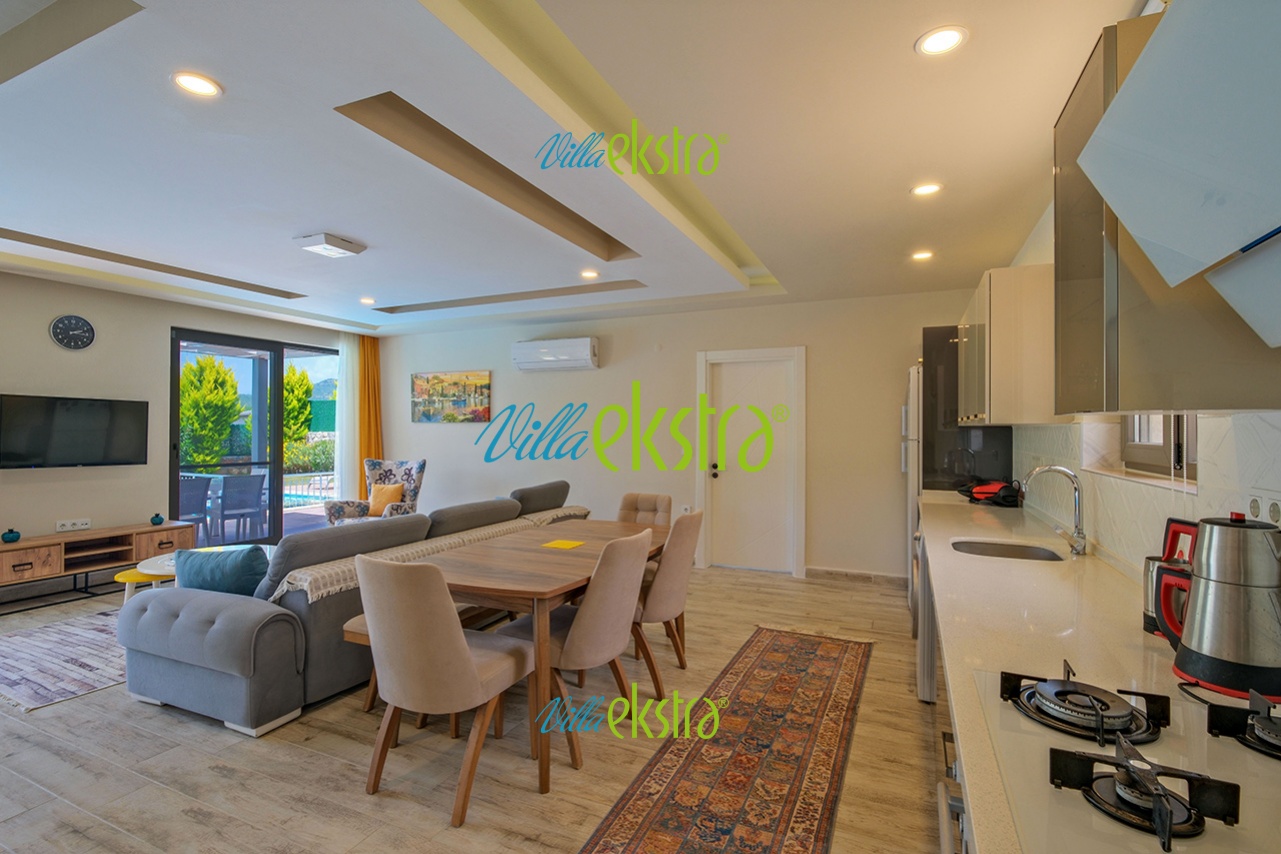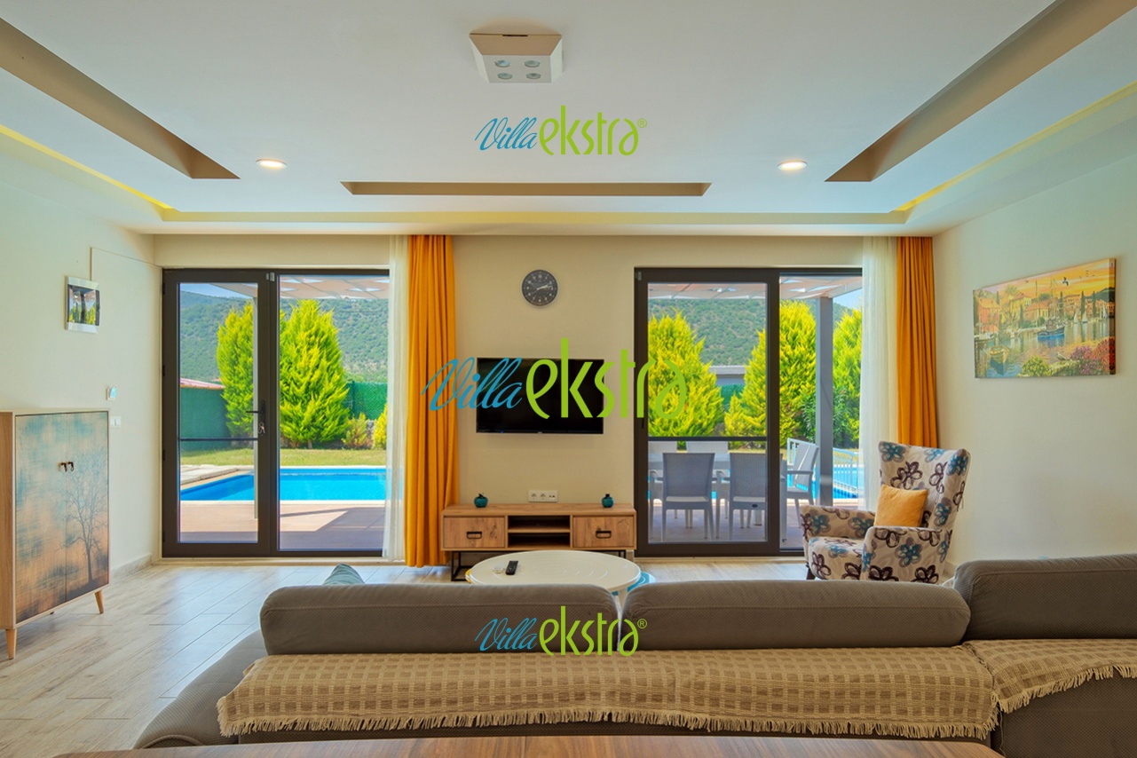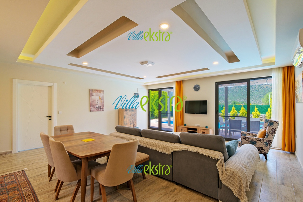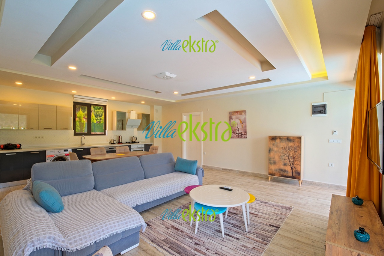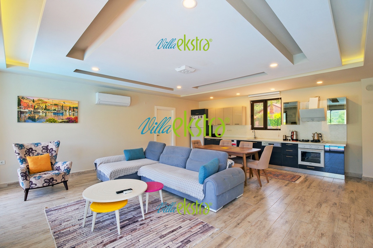 Rahat oturma grubu, orta sehpa, uydu alıcı, wifi, klima, Tv, Tv sehpası, yemek masası ve sandalyeler havuz terasına çıkış bulunmaktadır.