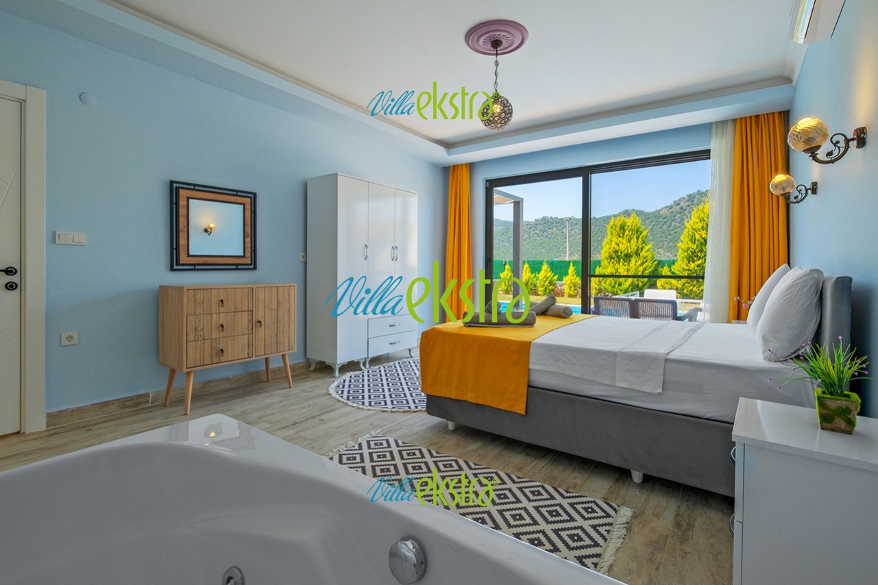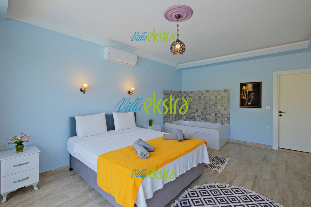 1. Yatak Odası: 1 adet çift kişilik yatak, komodin, klima, jakuzi, banyo&wc, havuz terasına çıkış bulunmaktadır.