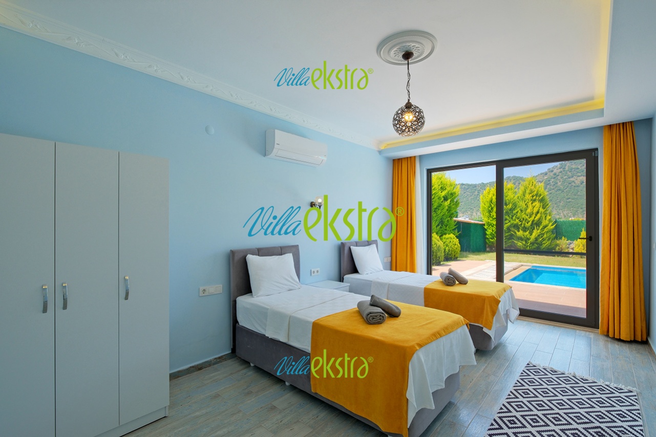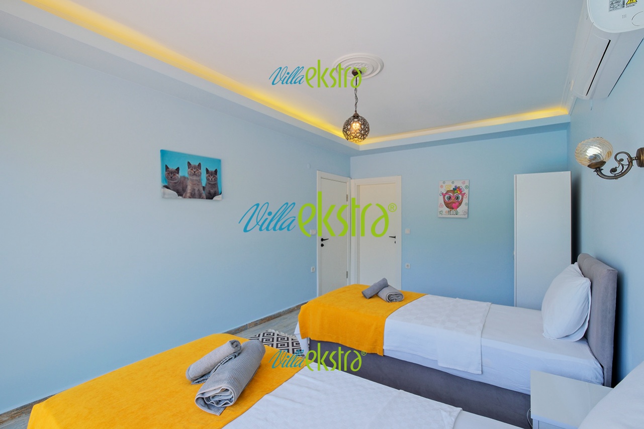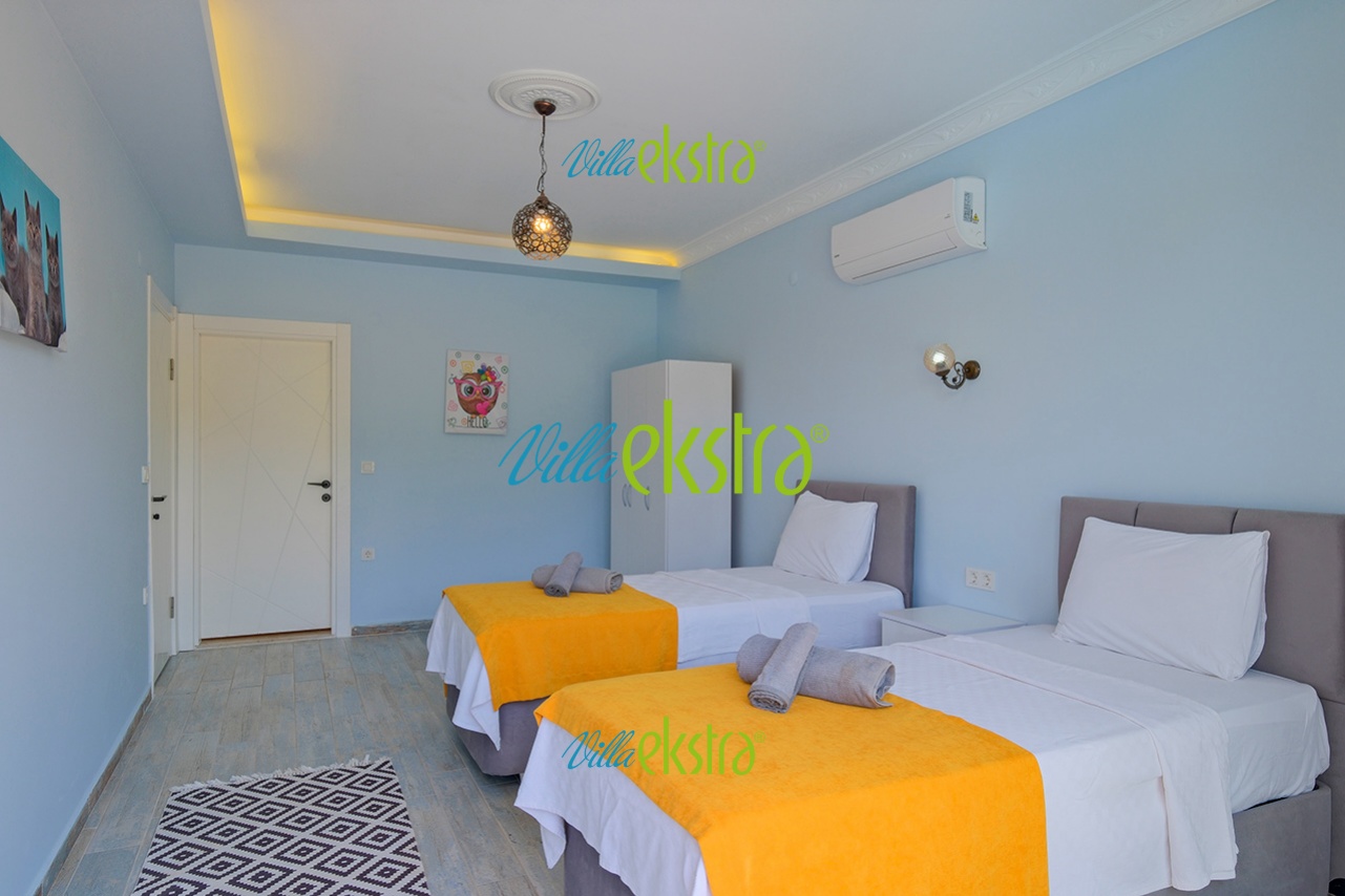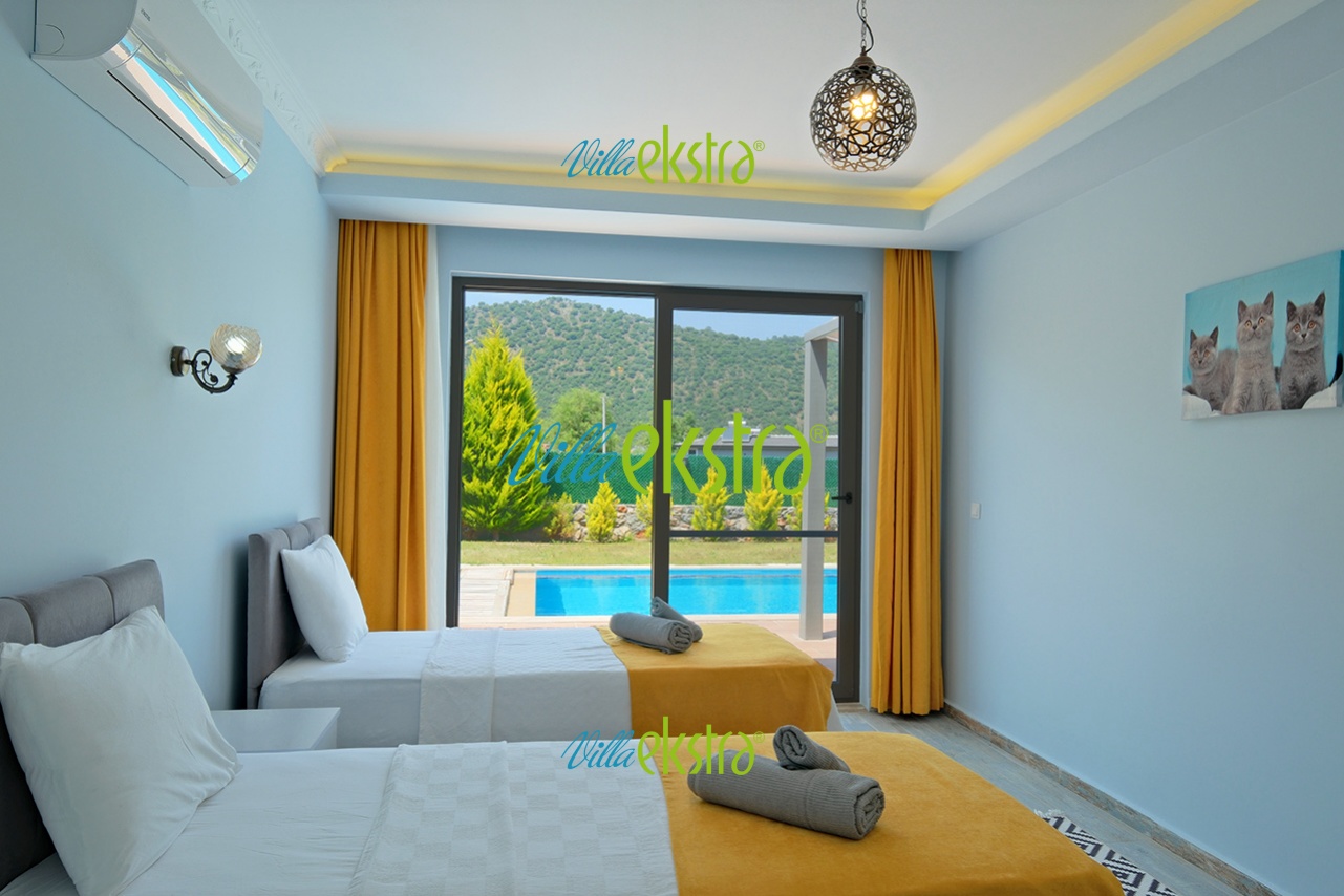 2. Yatak Odası: 2 adet tek kişilik yatak, komodin, klima, elbise dolabı, banyo&wc, havuz terasına çıkış bulunmaktadır.