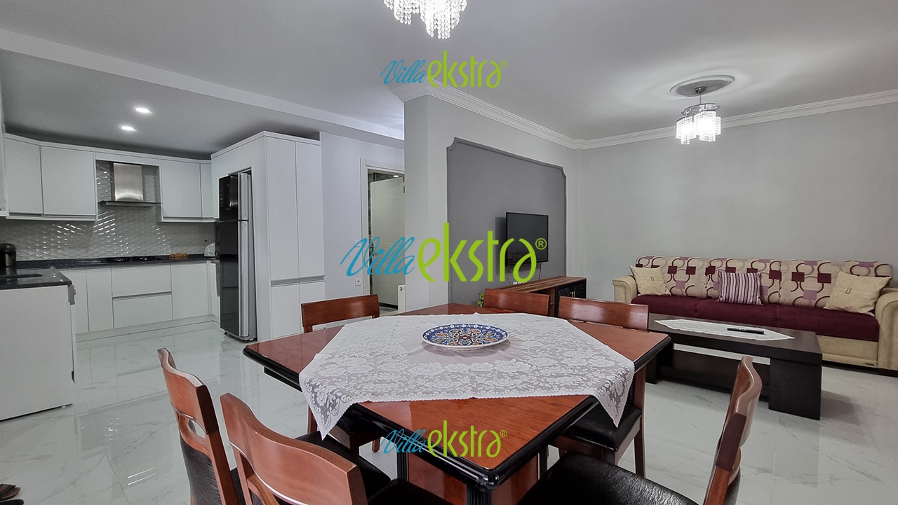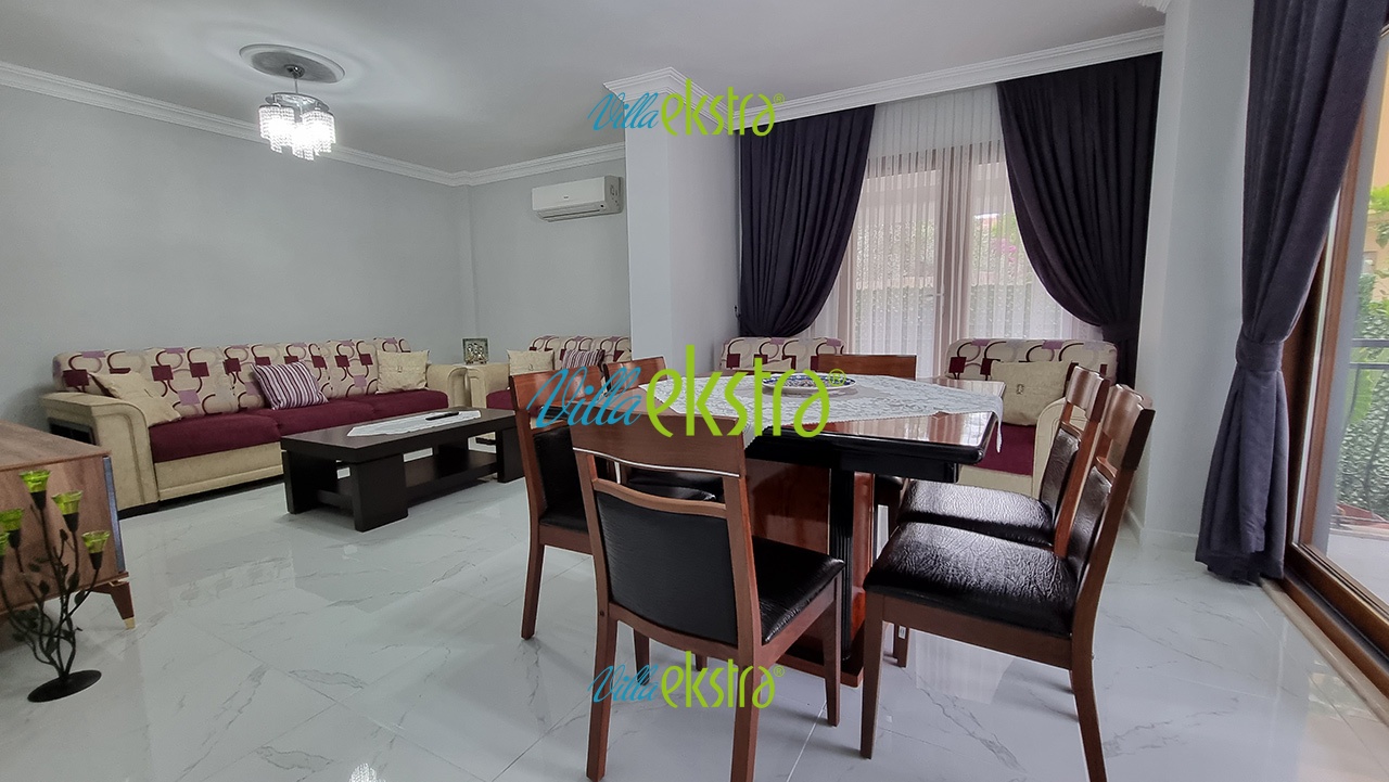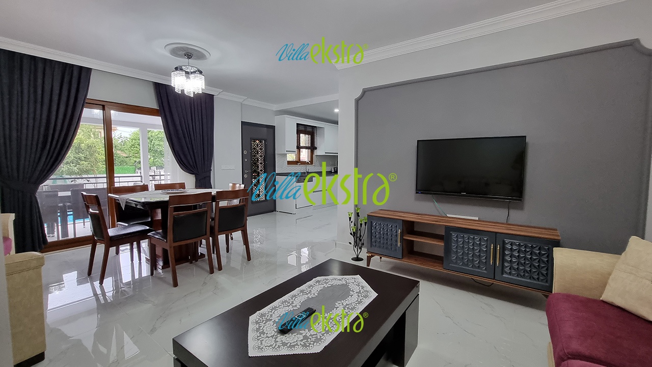 Konforlu oturma grubu, TV, TV ünitesi, klima, orta sehpa, Wifi, uydu alıcı, yemek masa ve sandalyeleri bulunmaktadır.