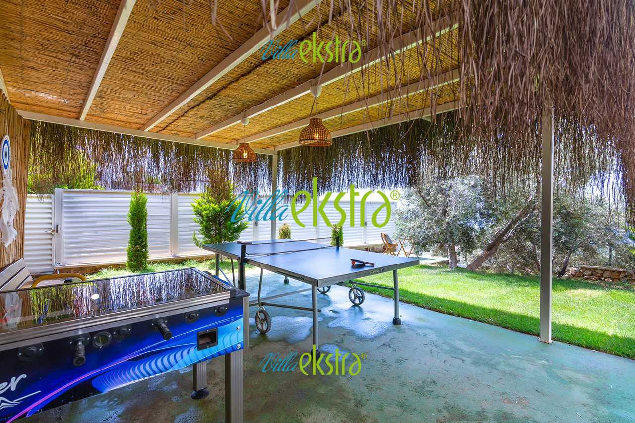 Bahçe içerisinde, masa, sandalyeler, şezlong, tenis masası, bahçe oturma grubu, güneş şemsiyesi, açık duş bulunmaktadır.