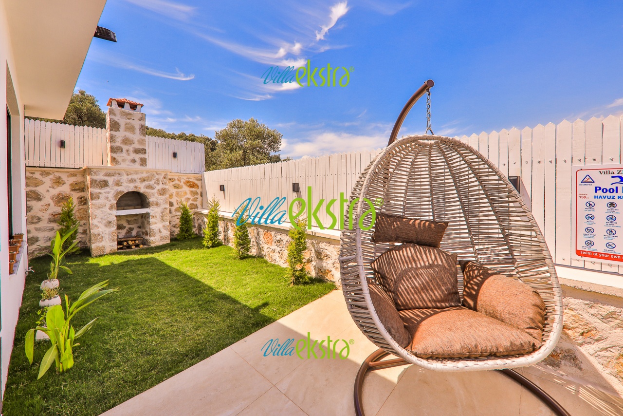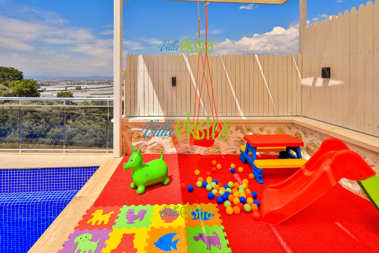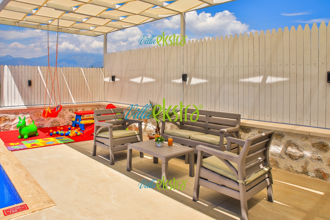 Mini oyun alanı, şezlonglar, damla salıncak, bahçe oturma grubu, yemek masası ve sandalyeleri, taş barbekü bulunmaktadır.