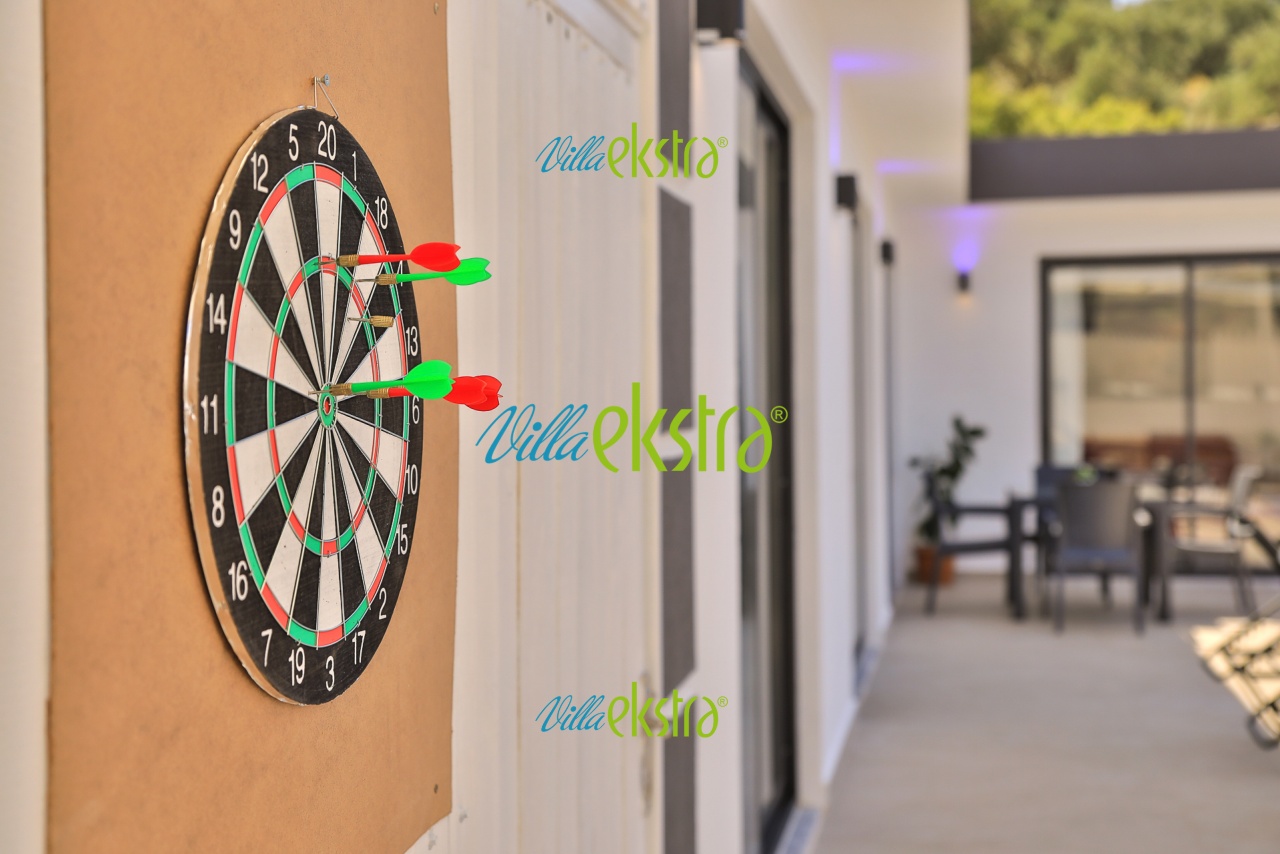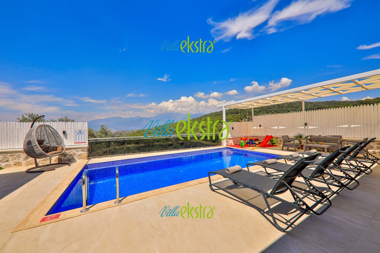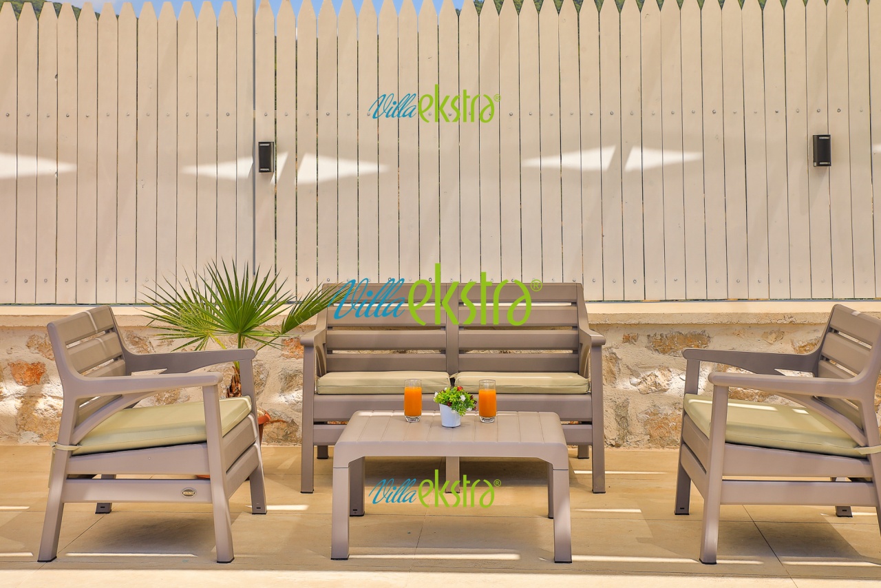 Mini oyun alanı, şezlonglar, damla salıncak, bahçe oturma grubu, yemek masası ve sandalyeleri, taş barbekü bulunmaktadır.