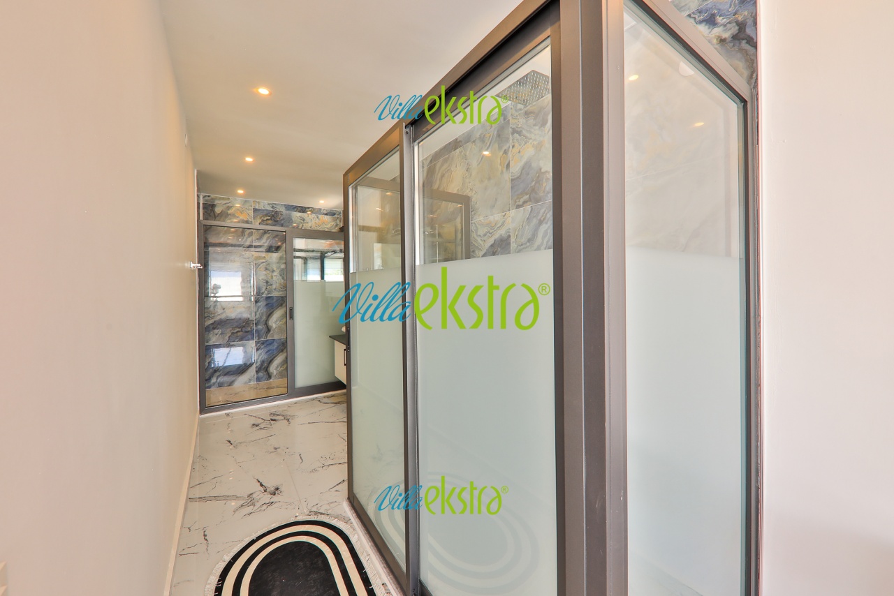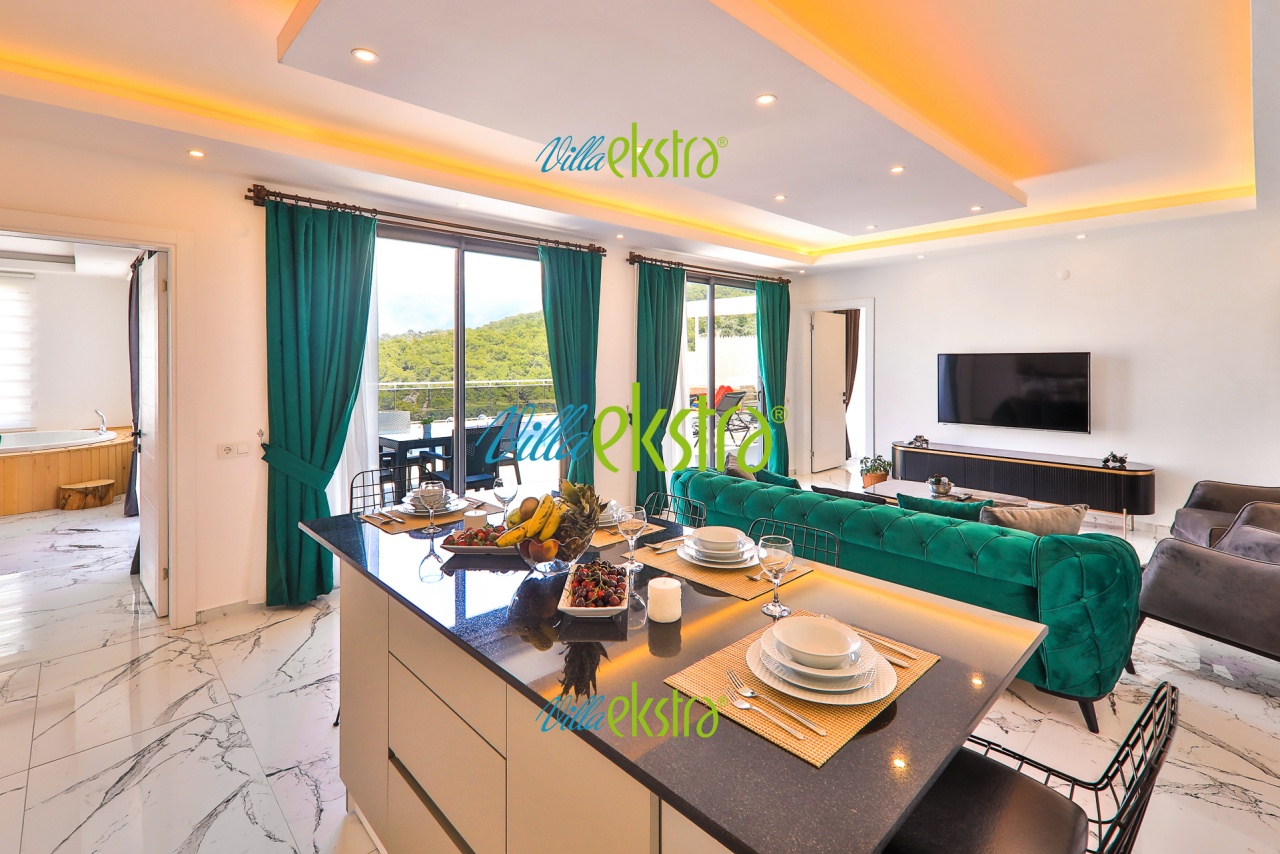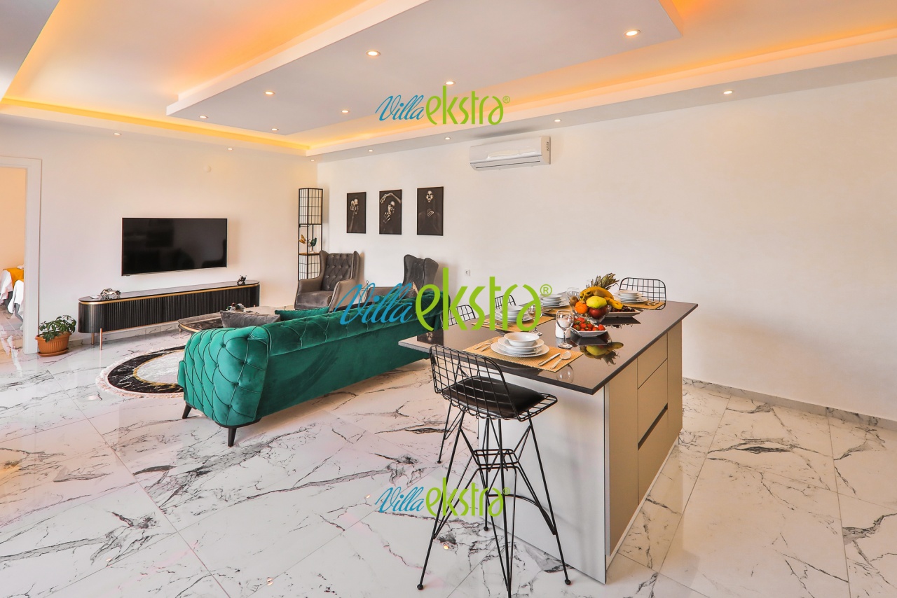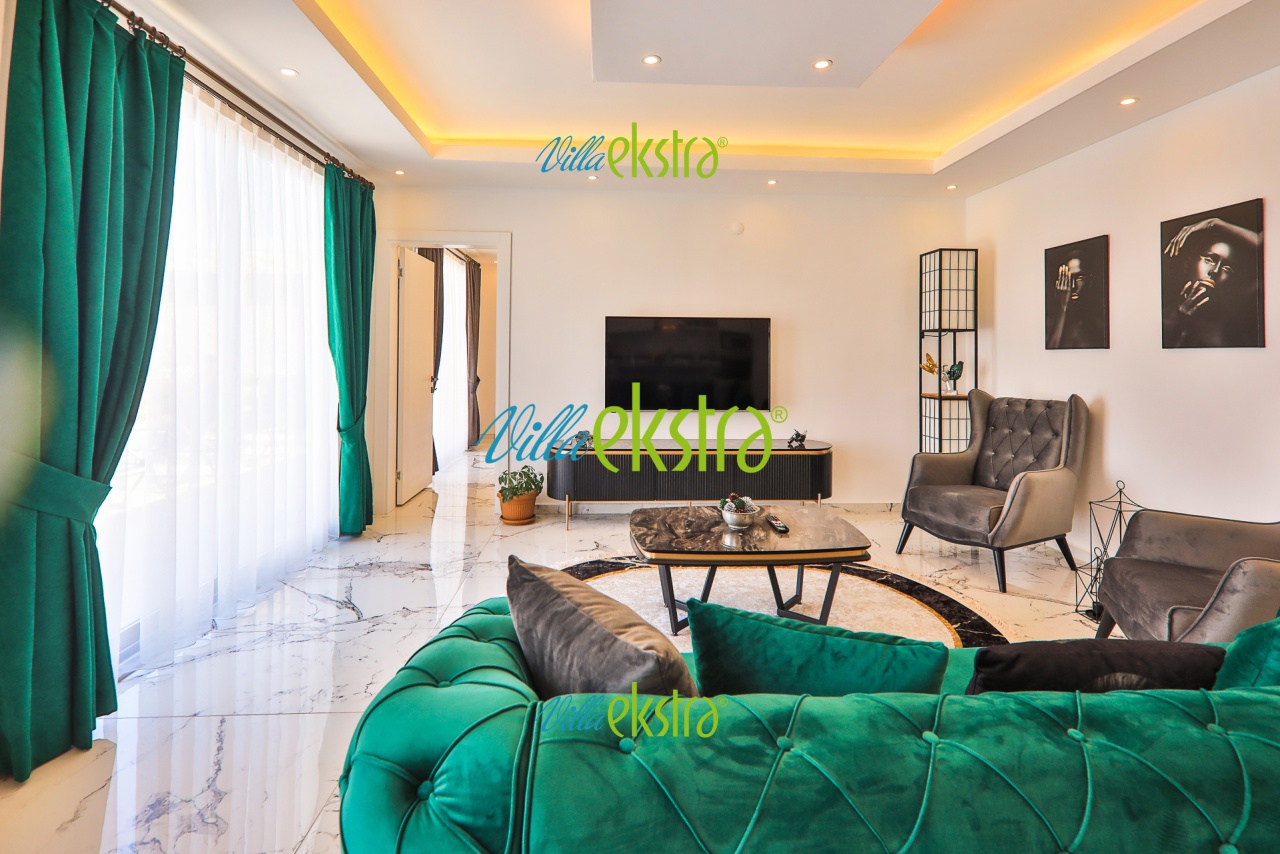 Modern oturma grubu, orta sehpa, TV, TV ünitesi, klima, havuz terasına çıkış bulunmaktadır.