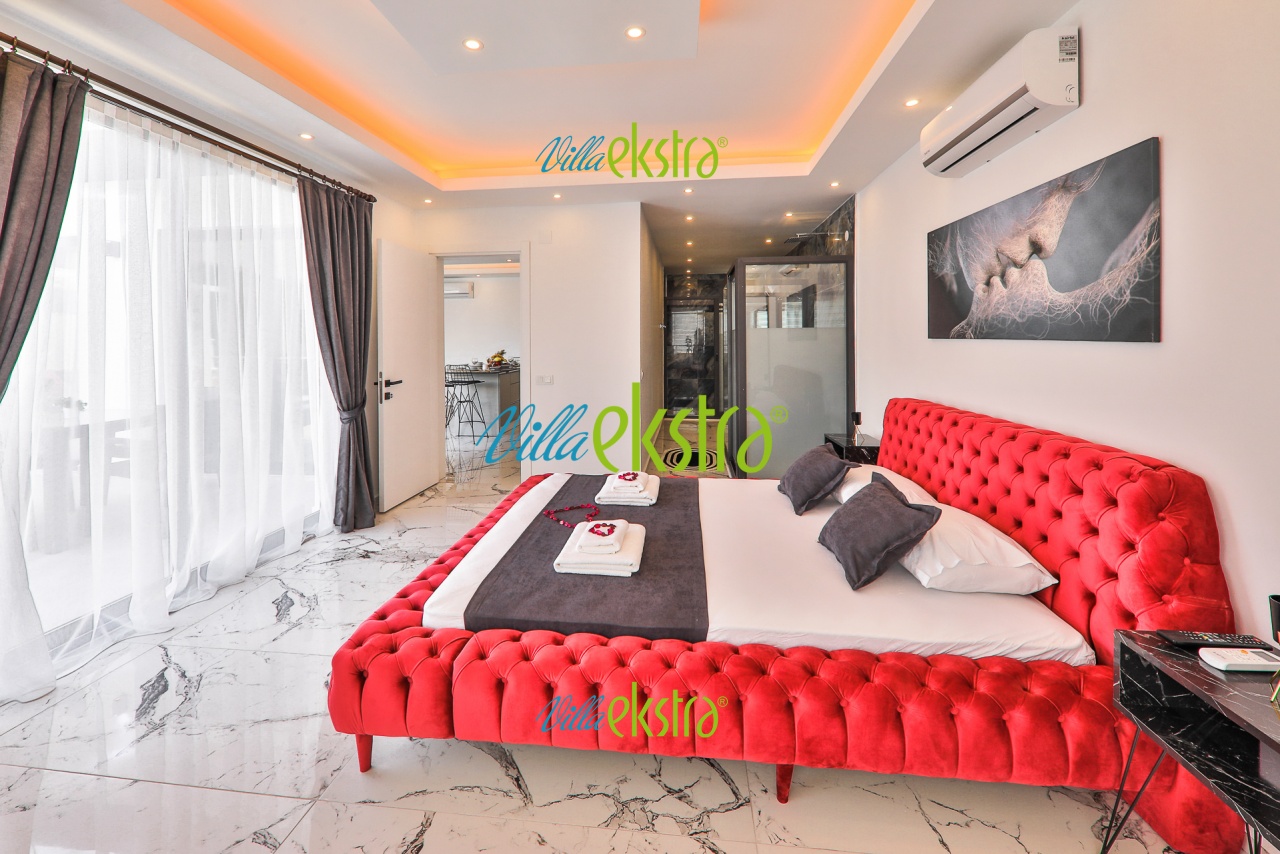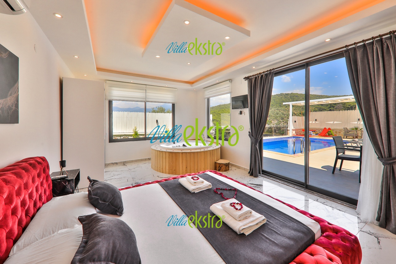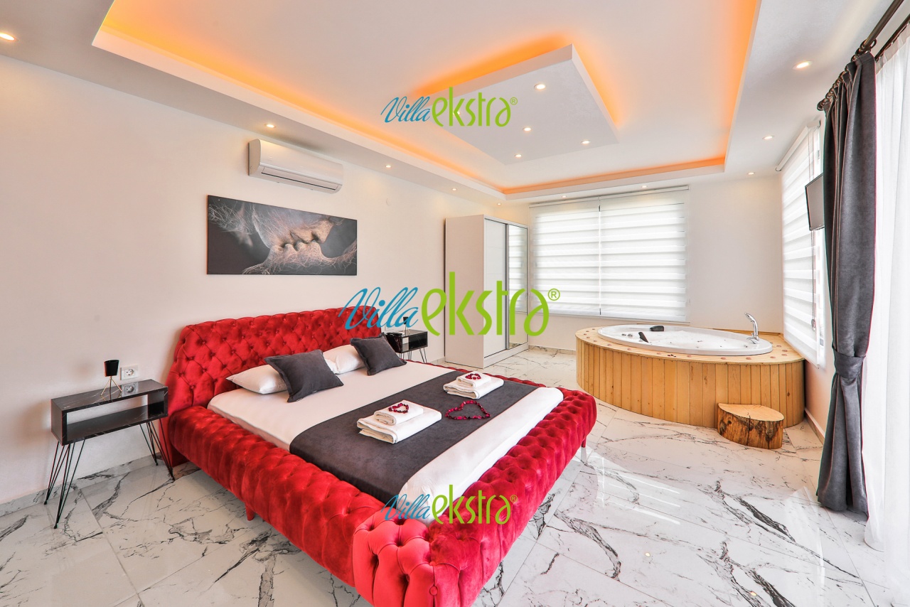 1. Yatak Odası: Suit oda, 1 adet çift kişilik yatak, elbise dolabı, jakuzi, TV, komodin, WC&banyo, klima, havuz terasına doğrudan çıkış bulunmaktadır.