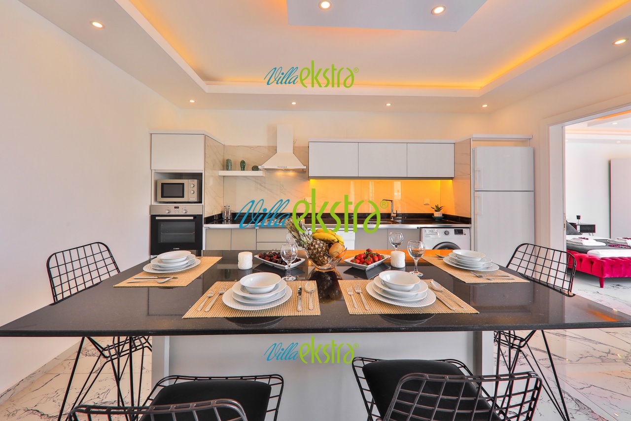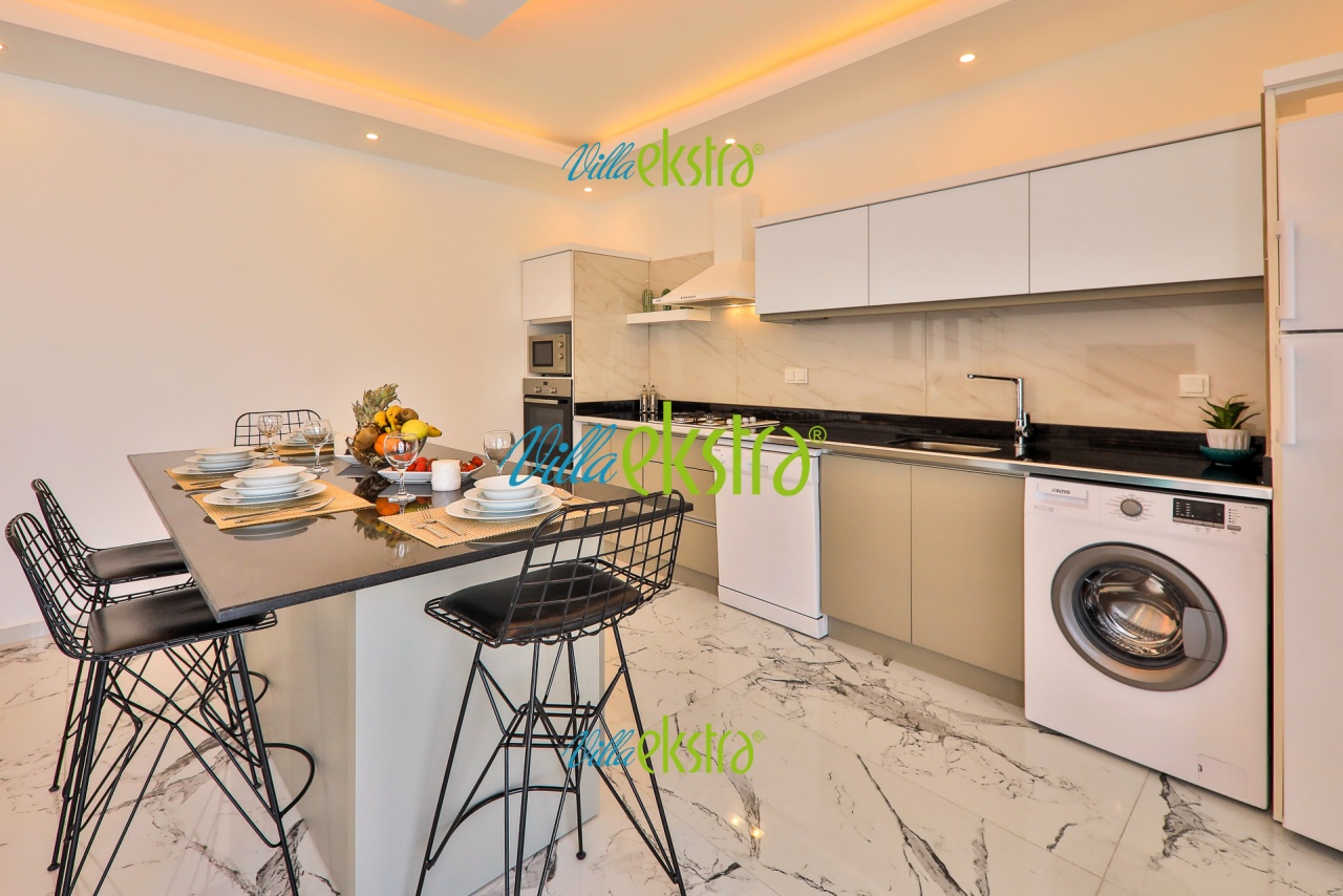 Modern Amerikan mutfak, buzdolabı, bulaşık makinesi, çamaşır makinesi, ankastre fırın, ankastre 4’lü ocak, yemek masası ve sandalyeleri, mutfak araç gereçleri bulunmaktadır.