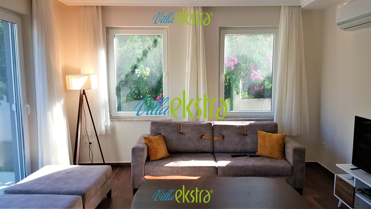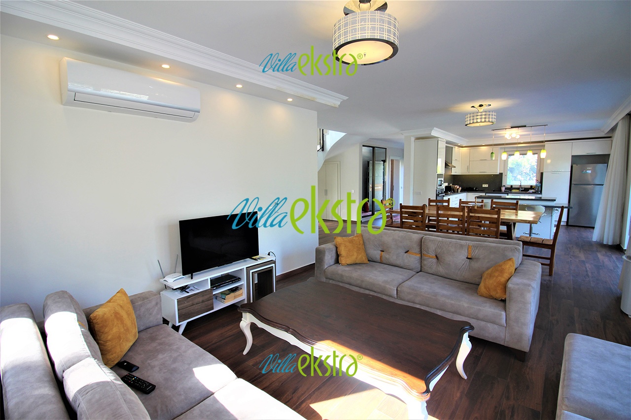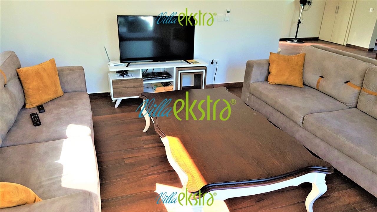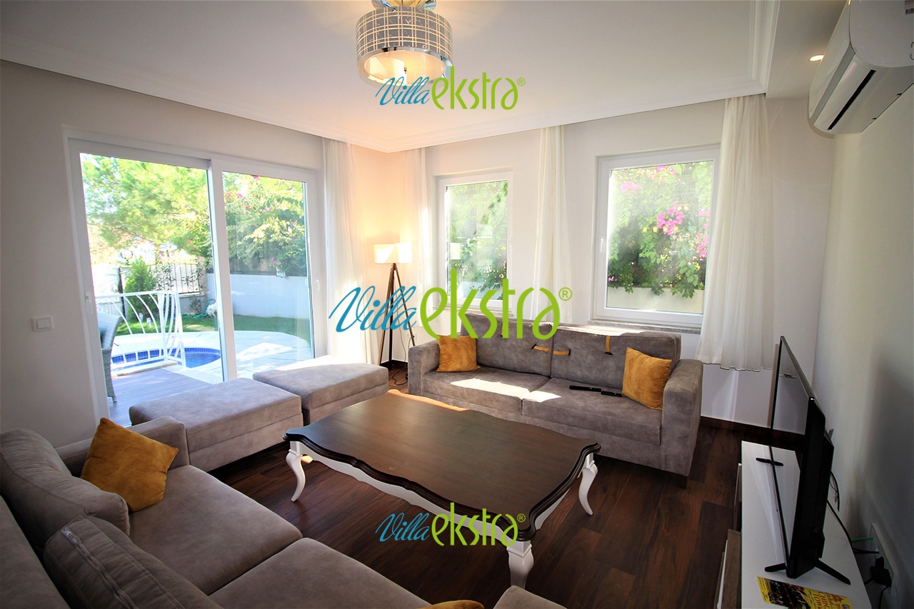 Rahat oturma grubu, orta sehpa, klima, TV, Tv sehpası, havuz terasına çıkış bulunmaktadır.